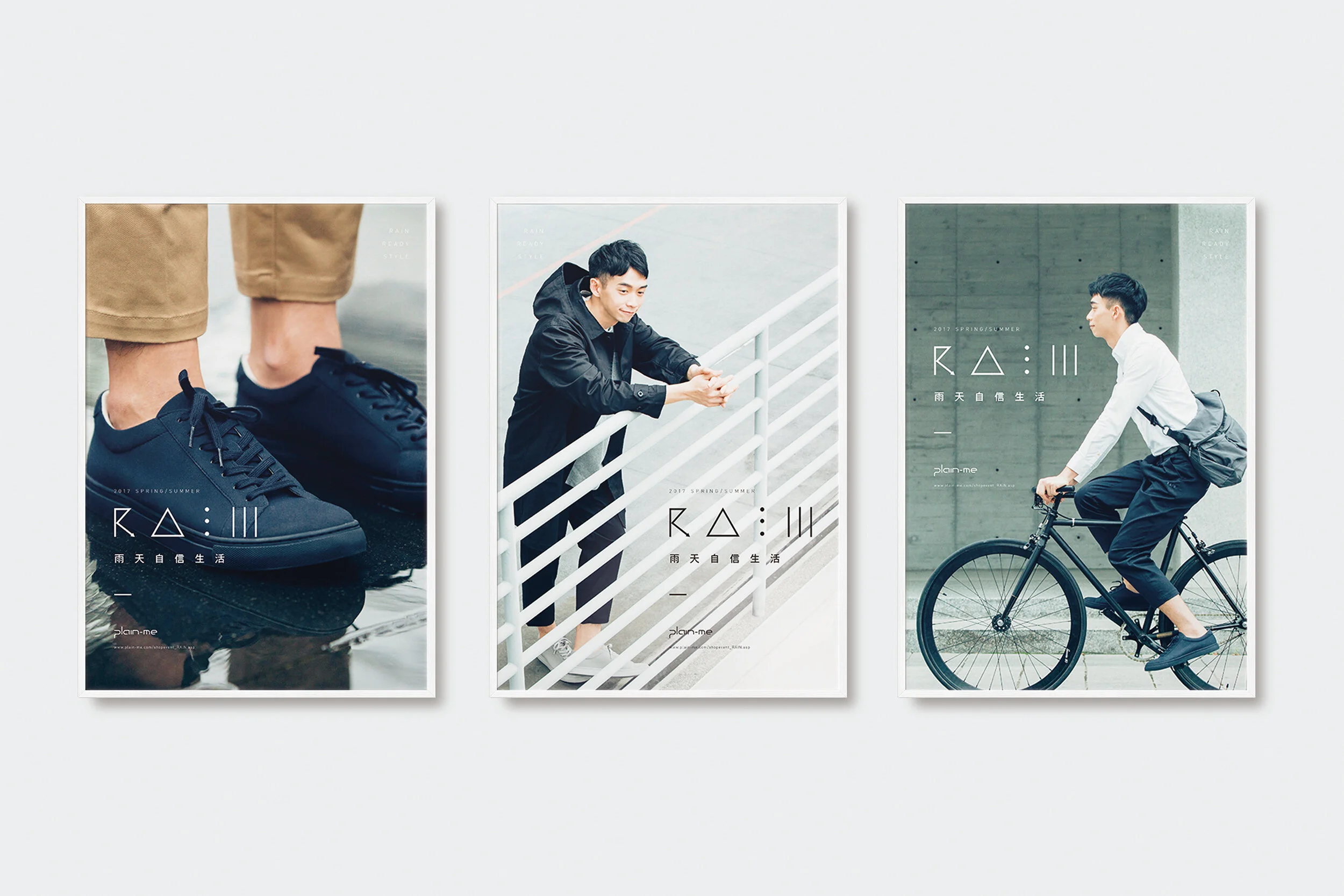 扭轉消費者對雨天出門的各種壞印象,成為雨季企劃的主軸。由國際氣象科學符號轉化而成的「RAIN」主視覺,其低調的幾何元素隱身於商品、視覺設計中,不搶走服飾本身與穿著者的風格。