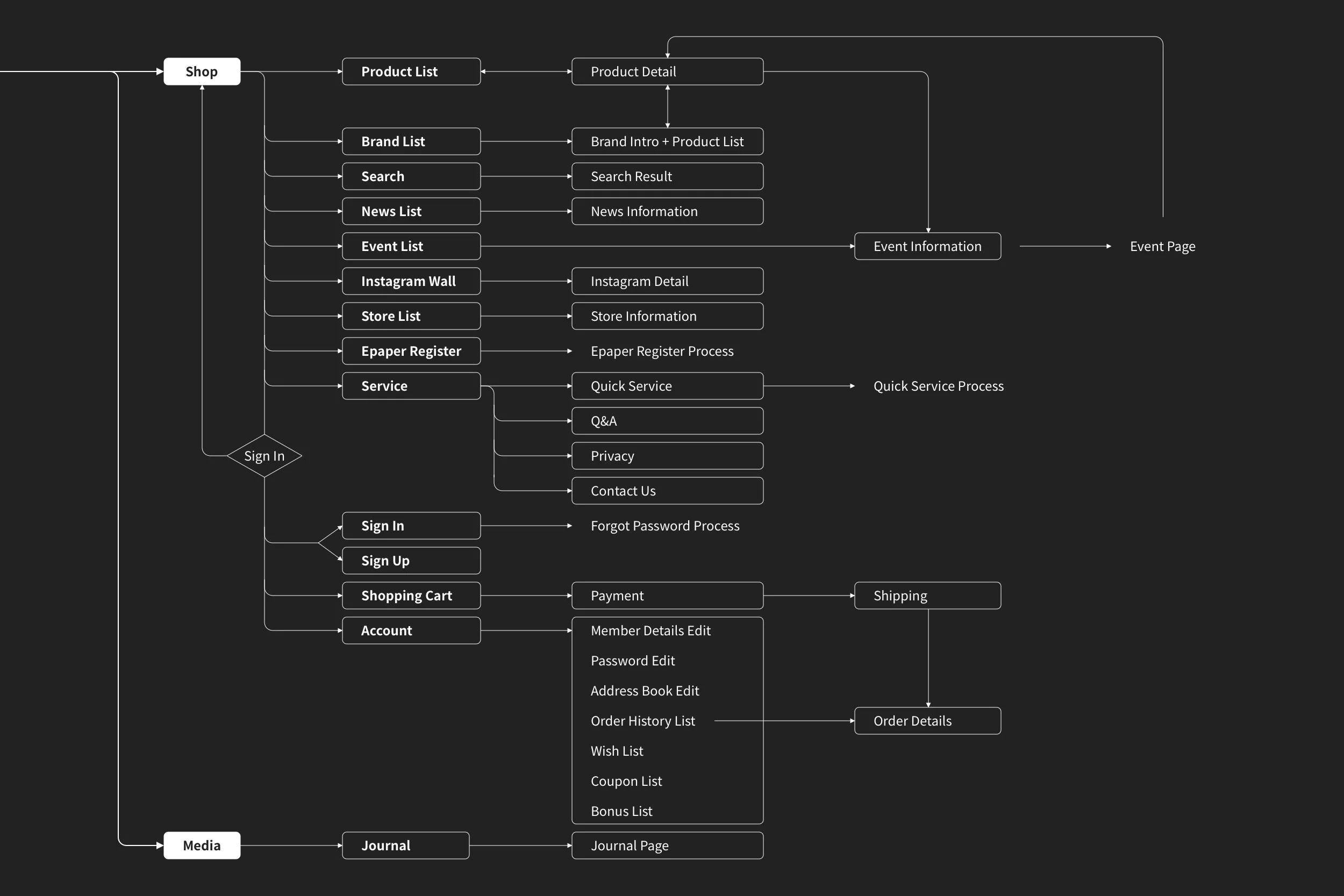 透過資訊架構的的重整,規劃流程、頁面框架、共用元件及整體用色,設計上以 RWD 為基礎,堆疊大量圖塊,讓視覺重心集中在商品與模特兒身上。